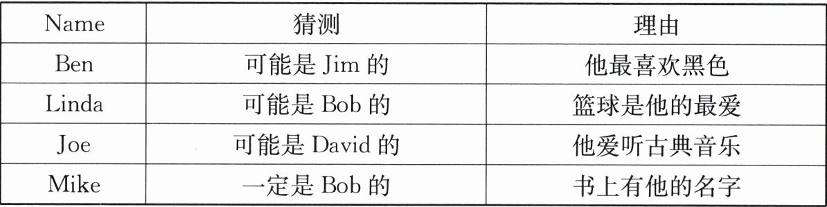 Mike 在操场上捡到一个黑色的双肩背包,包里有一本篮球杂志、几本书和一张古典音乐的 CD。包的主人是谁呢?下面表格中的内容是 Mike 和其他三个同学的猜测及理由。请你根据表格提示,以“Whose backpack is it?”为题写一篇英语短文。