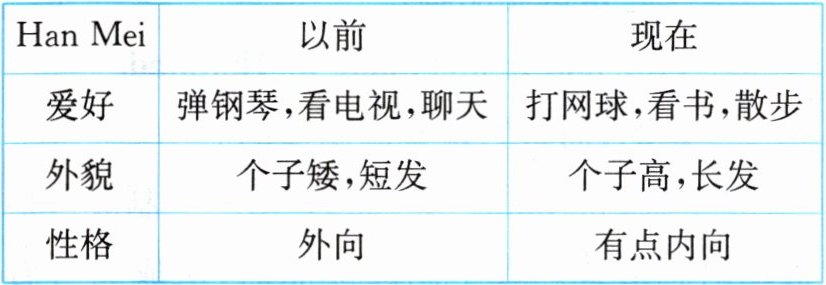 根据表格内容提示,写一篇关于 Han Mei 的成长变化的短文。词数 80~100。