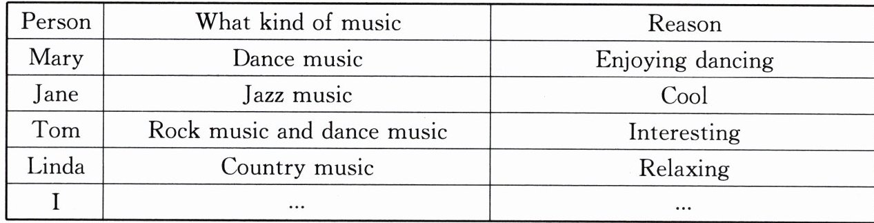 One possible version: Music is important to us. It can bring us energy and make us happy. Different people like different kinds of music. Mary loves music that she can dance to, because she enjoys dancing. Jane likes jazz music. She thinks jazz is really cool. Tom enjoys rock music and dance music very much. He thinks they are interesting. Linda prefers music that is relaxing, so she likes country music a lot. I also like country music because it can make me feel quiet.