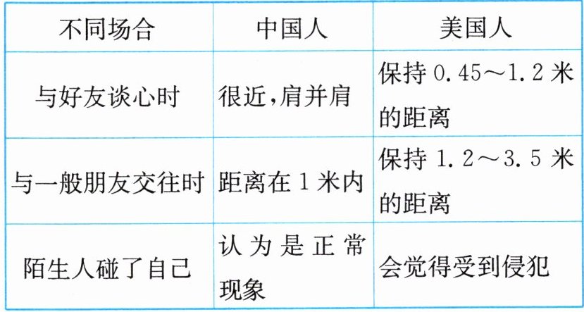 People keep different physical distances in different cultures. The table shows us the differences of physical distances in social situations in China and America.