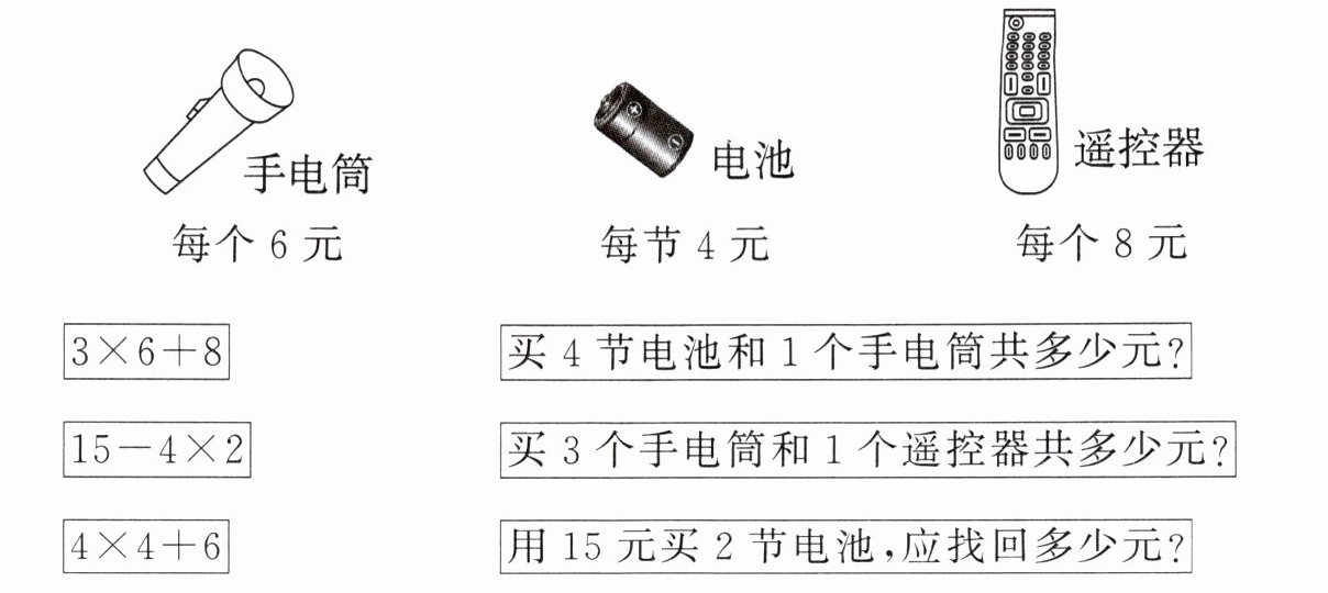 $15 - 4 × 2$ 买 $3$ 个手电筒和 $1$ 个遥控器共多少元?