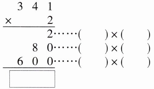 $\begin{array}{r} 341\\ ×\ \ \ \ \ 2\\ \hline 2\\ 80\\ 600\\ \hline □ \end{array}\cdots\cdots(\ \ \ \ )×(\ \ \ \ )\cdots\cdots(\ \ \ \ )×(\ \ \ \ )\cdots\cdots(\ \ \ \ )×(\ \ \ \ )$