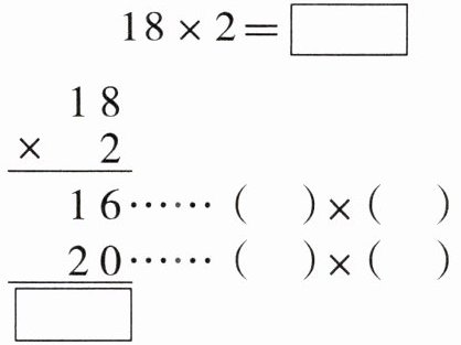 $ \begin{array} { r } { 1 8 } \\ { × \quad 2 } \\ \hline 1 6 \cdots \cdots ( \quad ) × ( \quad ) \\ 2 0 \cdots \cdots ( \quad ) × ( \quad ) \\ \hline □ \end{array} $