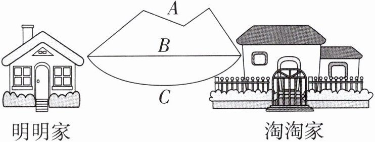 7. 如图,从明明家到淘淘家有三条路可以走,其中哪条路最近?说明原因。