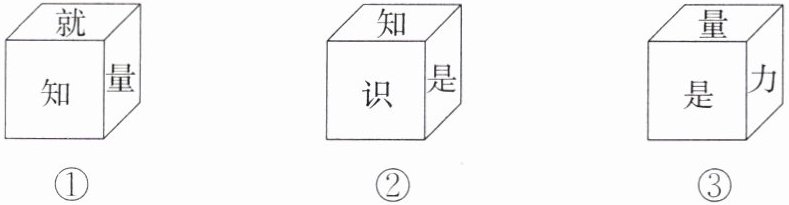 9 一个正方体的六个面上,分别写着“知识就是力量”六个字,根据这个正方体的三种不同的摆法,判断“知”的对面是(