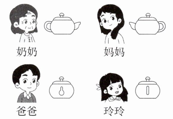 7 桌子上放着一把茶壶,玲玲一家四口围坐在一起,根据他们看到的图形,猜一猜他们都坐在桌子的哪个位置。(把名字填在相应的方框里)