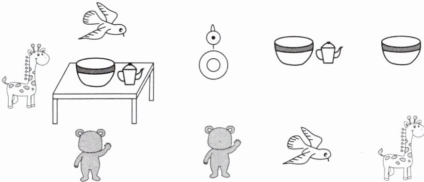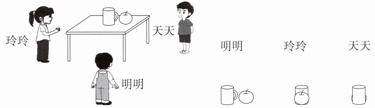 1. 明明-第一个图,玲玲-第二个图,天天-第三个图;2. 小熊-单个碗图,小鸟-两个圆形图,长颈鹿-碗和茶壶图;3. 第一个展开图-瘦高长方体,第二个展开图-正方体,第三个展开图-矮胖长方体。