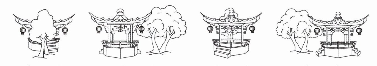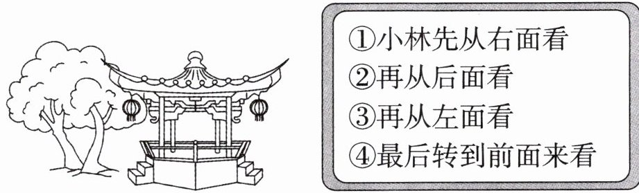 如图,小林绕凉亭一圈,请你按照他的观察顺序,在四幅图下面标出①②③④。