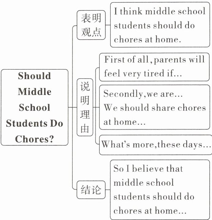 3.实战演练 Should Middle School Students Do Chores? I think middle school students should do chores at home. Here are three reasons. First of all, parents will feel very tired if they do all the housework at home, so we should help them do some chores. It can make us understand our parents better. Secondly, we are part of the family. We should share chores at home. We should do our part in keeping our rooms tidy. For example, we can make our beds and fold our clothes. What’s more, these days we depend on our parents too much. Doing chores can help us learn how to take care of ourselves. And it can help us have good living habits. It’s good for our future. So I believe that middle school students should do chores at home. It’s necessary and helpful to do some housework.