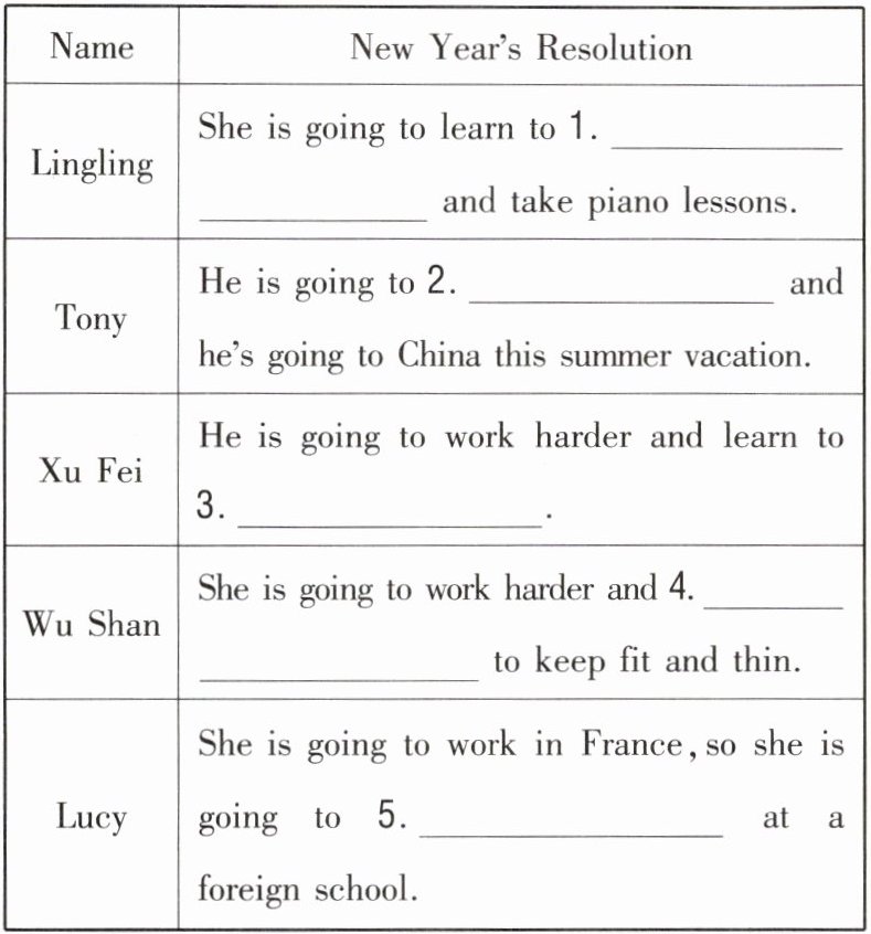 1.play an instrument 2.learn Chinese 3.play football 4.take more exercise 5.study French