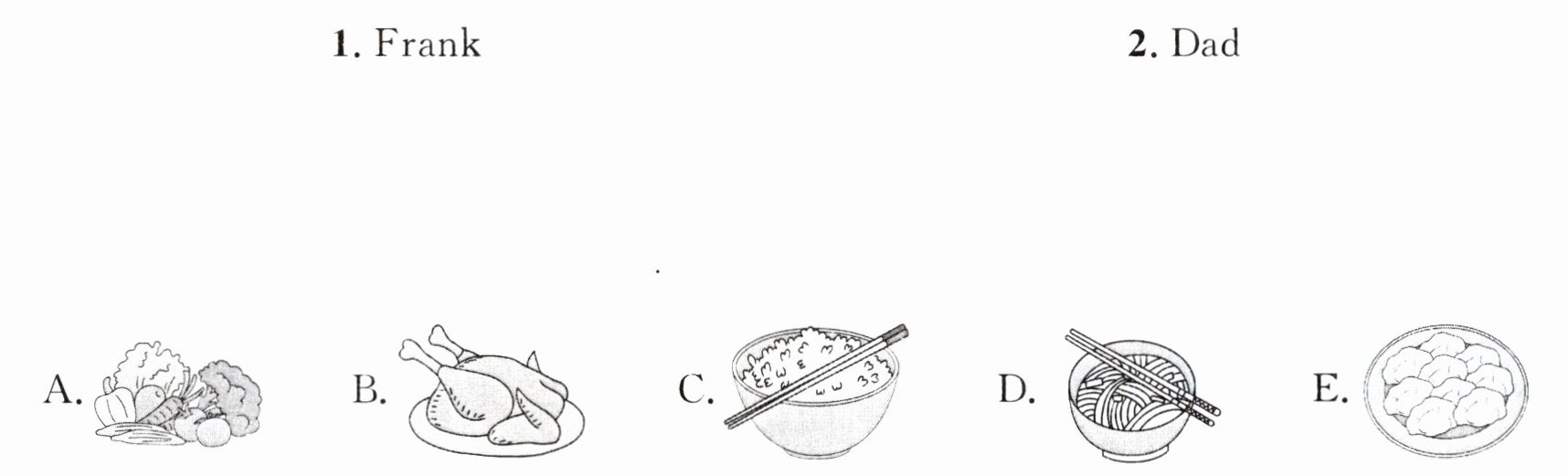 | Dad:Do you like vegetables? Frank:Yes,I do. They’re good for us. | Frank:I like noodles. What do you like,Dad? Dad:I like chicken and rice. |