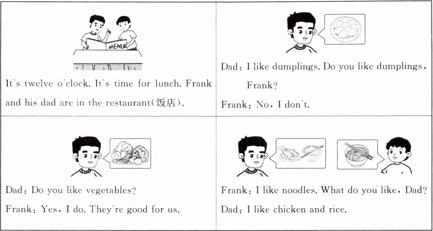 | It’s twelve o’clock. It’s time for lunch. Frank and his dad are in the restaurant(饭店). | Dad:I like dumplings. Do you like dumplings,Frank? Frank:No,I don’t. |