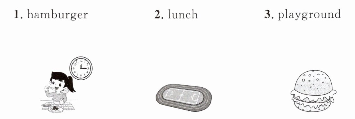 1. hamburger 连第三幅图 2. lunch 连第一幅图 3. playground 连第二幅图
