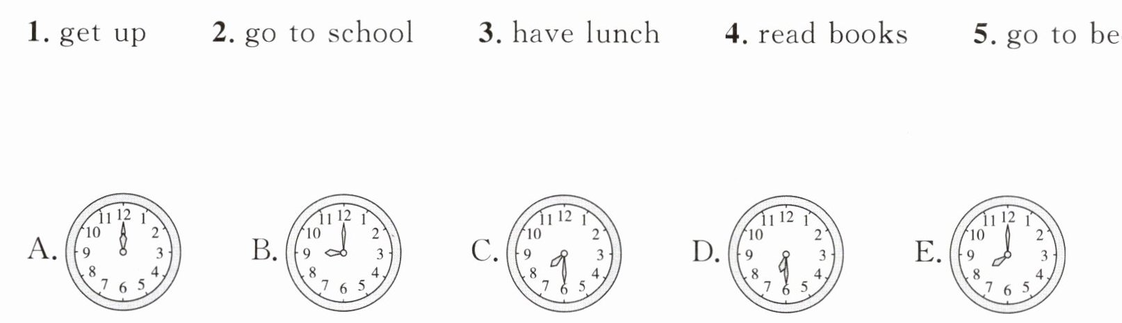 1. get up 2. go to school 3. have lunch 4. read books 5. go to bed