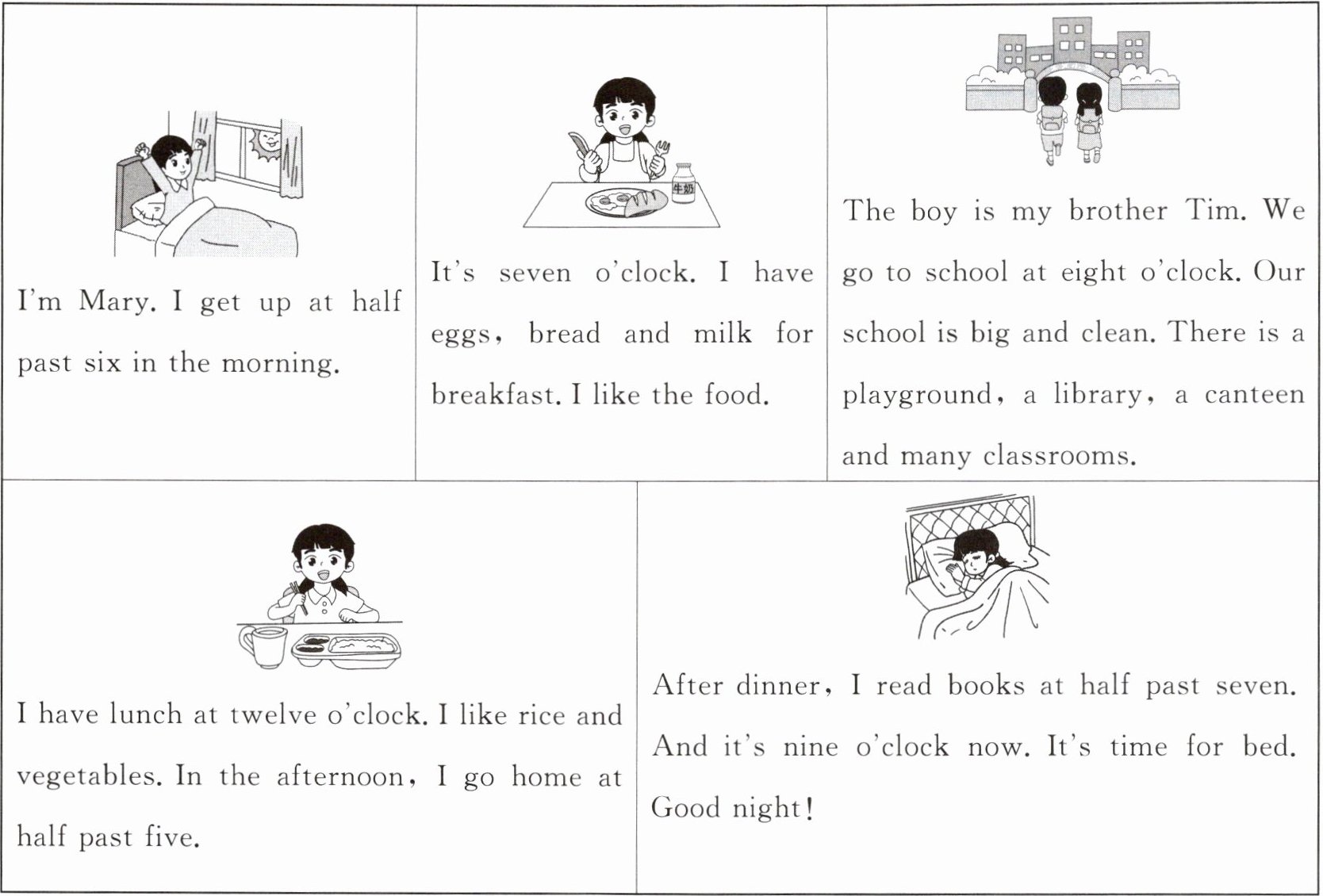 After dinner, I read books at half past seven. And it's nine o'clock now. It's time for bed. Good night! |