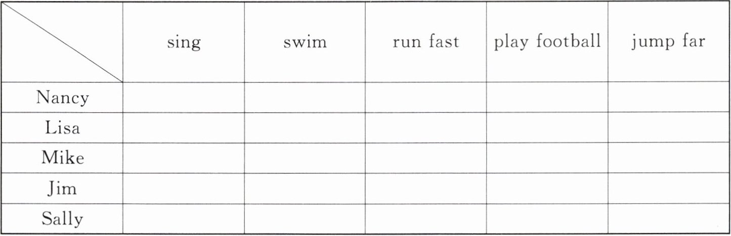 Ⅲ. Nancy 和她的小伙伴有什么样的能力呢?快来听听他们的介绍吧。听短文,在表格内相应的位置打“√”。