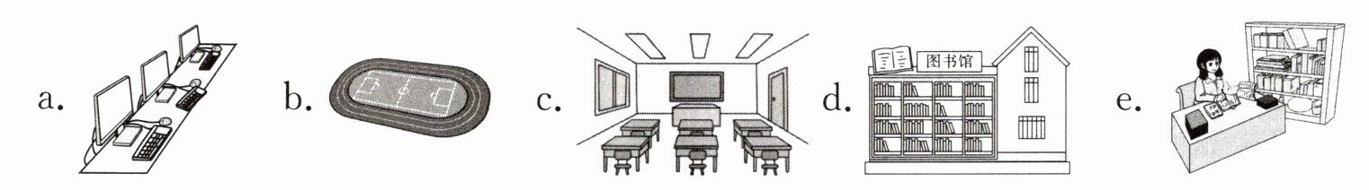 1.B e 解析:根据前一句"下课后,我们老师在这里工作"可知,B项"教师办公室"符合题意,且图片e与之相符。2.D d 解析:根据后一句"我们可以在这里读很多书"可知,D项"图书馆"符合题意,且图片d与之相符。3.A a 解析:根据后一句"里面有很多电脑"可知,A项"计算机室"符合题意,且图片a与之相符。4.E b 解析:根据后半句"在那里踢足球"可知,E项"操场"符合题意,且图片b与之相符。5.C c 解析:根据后一句"有很多书桌和椅子"可知,C项"教室"符合题意,且图片c与之相符。