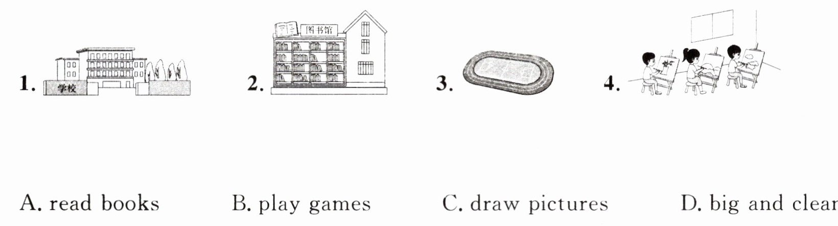 A. read books B. play games C. draw pictures D. big and clean