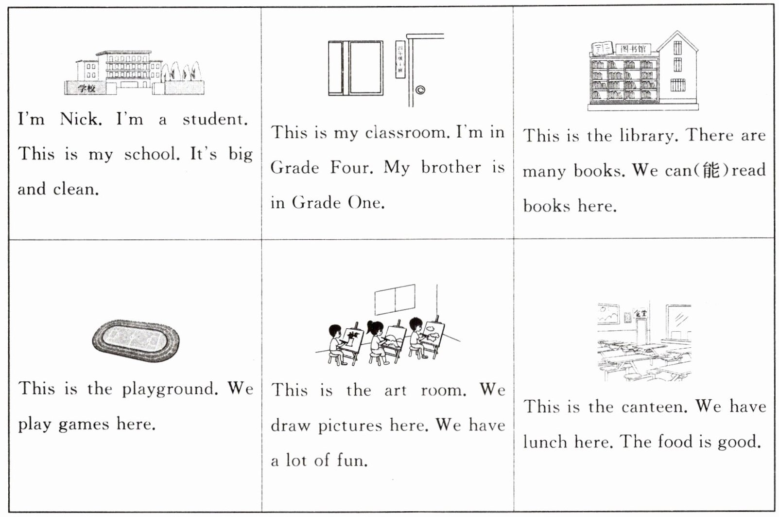 |I’m Nick. I’m a student. This is my school. It’s big and clean.|This is my classroom. I’m in Grade Four. My brother is in Grade One.|This is the library. There are many books. We can(能)read books here.|