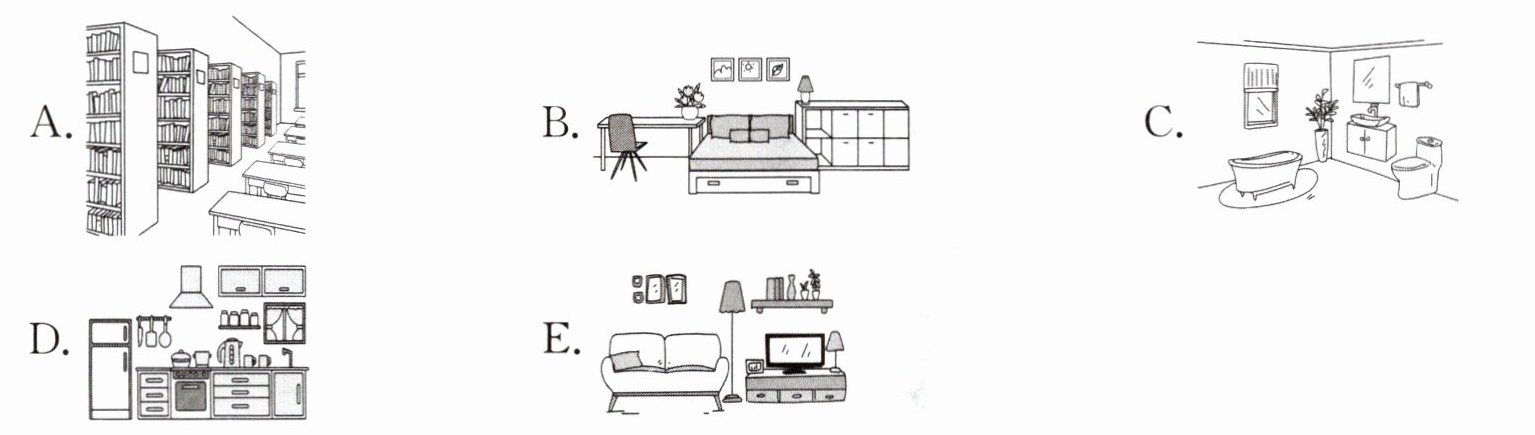 1.E;living room 2.D;kitchen 3.B;bedroom 4.A;reading room 5.C;bathroom