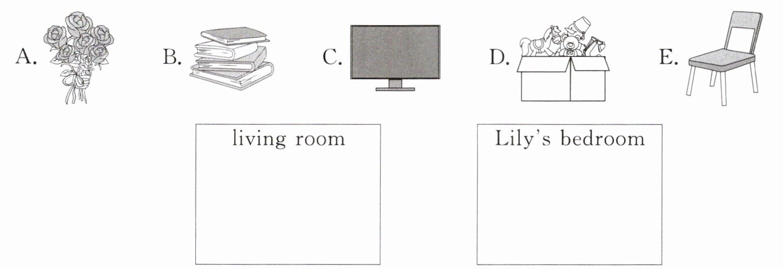 任务一:living room:A C D Lily's bedroom:B E 任务二:1.× 解析:根据"There are two bedrooms,a living room,a kitchen and a bathroom."可知,有一个浴室,故该句与原文描述不符。2.√ 解析:根据"This is the living room. It's big and clean."可知,客厅大,故该句描述与原文相符。3.× 解析:根据"That is my bedroom. It's pink."可知,Lily 的卧室是粉色的,故该句与原文描述不符。