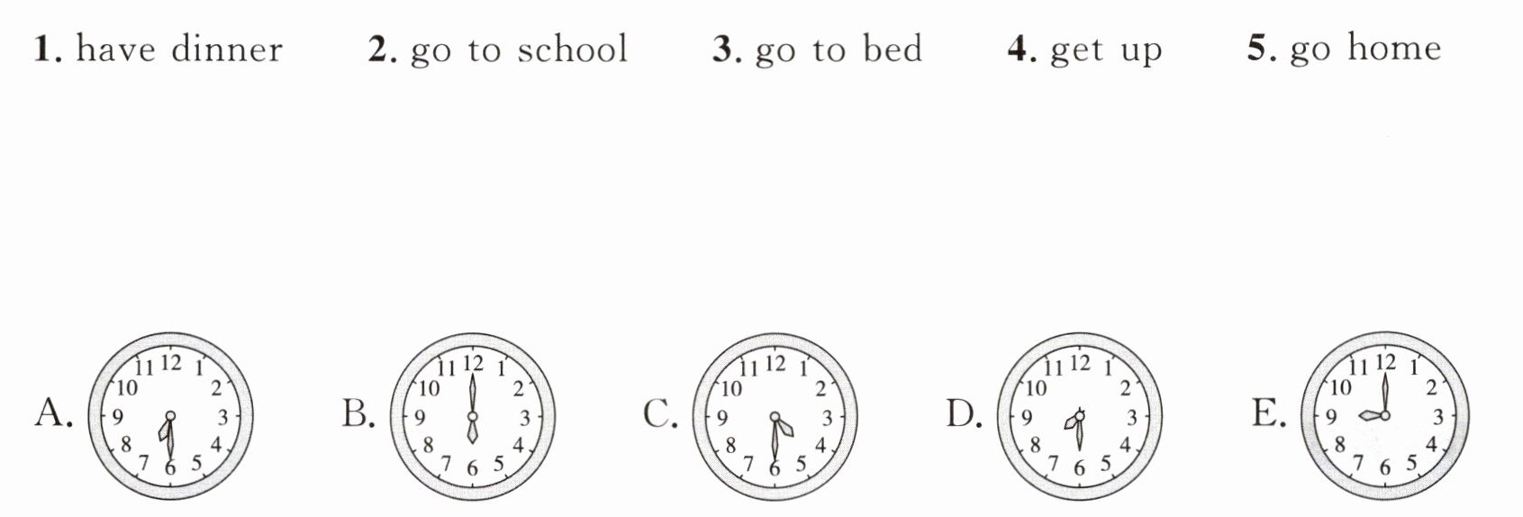 1. have dinner 2. go to school 3. go to bed 4. get up 5. go home