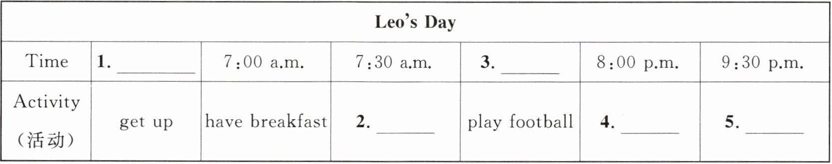 | Activity(活动) | get up | have breakfast | 2. ______ | play football | 4. ______ | 5. ______ | |