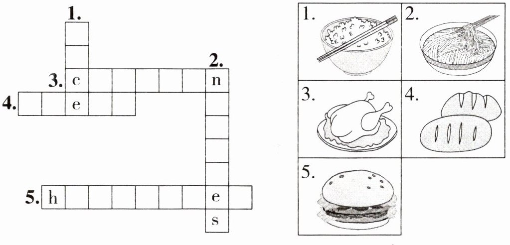 1. rice 2. noodles 3. chicken 4. bread 5. hamburger