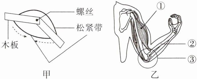 8. (2024宿迁)模型制作是学习生物学的一种有效方法。图甲是某同学利用木板、松紧带、螺丝等材料制作的一个肌肉牵拉骨运动的模型,图乙是人体屈肘动作示意图。图甲中的木板、松紧带、螺丝分别相当于图乙中的(