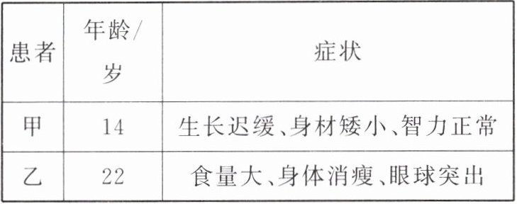 7. 如下表格是某医生记录的两位患者的病症,下列激素分泌异常能分别引起甲、乙患病的是(