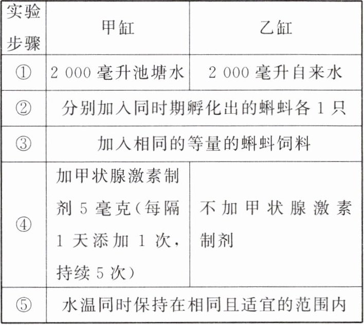 (2)第①步中应该在两缸中加同样的池塘水 第②步中各加入1只蝌蚪太少,应至少各加入10只蝌蚪