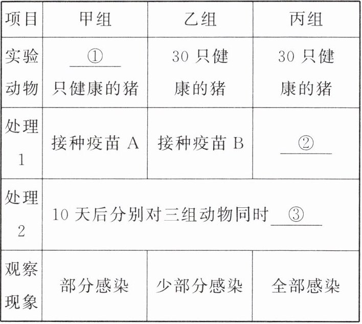 (2)a.①30 ②注射生理盐水 ③注射等量的非洲猪瘟病毒 b.形成对照 c.疫苗A、B均有效,且疫苗B效果更好