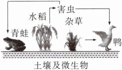 17. 稻鸭共生生态系统是一种具有显著生态和经济优势的农业发展模式,在这个生态系统中,鸭子为稻田除虫、除草、施肥和松土,而稻田又为鸭群提供食物及休息的场所。如图为此生态系统部分生物之间的关系,下列有关说法正确的是(