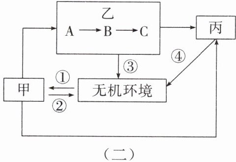 20. 图(一)为某湿地公园生态系统的部分食物网,图(二)为该生态系统的物质循环模式图(甲、乙、丙表示生物部分,A、B、C是乙中存在着食物关系的三种生物,①②③④表示某些生理过程),请据图分析并回答问题。