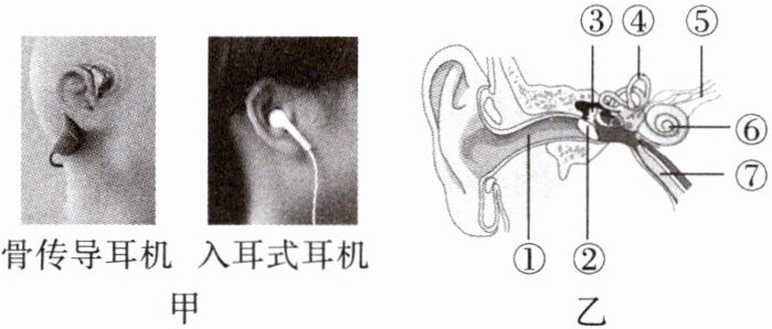 21. 研究人员根据人耳结构(如图乙)利用空气传导和骨传导听到声音的两种方式,制造出“骨传导耳机”和“入耳式耳机”(如图甲),请据图回答下列问题。