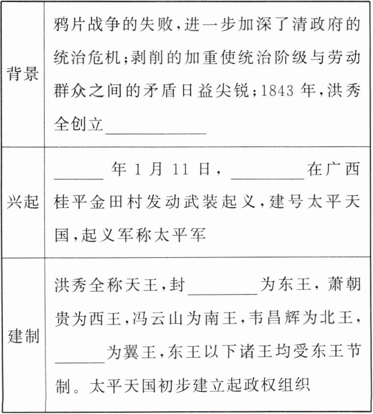 |兴起|______年1月11日,______在广西桂平金田村发动武装起义,建号太平天国,起义军称太平军|