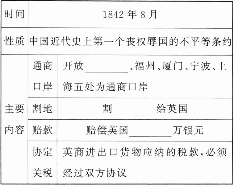 1. 广州;香港岛;2100。2. 虎门条约;片面最惠国待遇;望厦条约;黄埔条约。3. 政治:独立主权。经济:小农经济。历史发展进程:中国近代史。社会性质:半殖民地半封建社会。主要矛盾:中华民族。历史任务:民族独立。