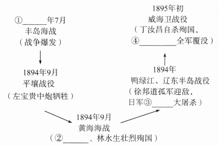 ①______年7月丰岛海战(战争爆发)→1894年9月平壤战役(左宝贵中炮牺牲)→1894年9月黄海海战(②______、林永生壮烈殉国)→1894年鸭绿江、辽东半岛战役(徐邦道孤军迎敌,日军③______大屠杀)→1895年初威海卫战役(丁汝昌自杀殉国,④______全军覆没)