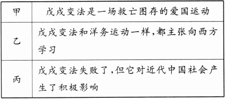 (4)同意丙的观点。理由:戊戌变法是中国近代第一次思想解放运动,也是资产阶级改良运动。由于维新派力量相对弱小,没有掌握实权,又缺乏必要的政治经验,变法最后以失败告终。但这场运动使更多仁人志士关心国家命运,促进了思想启蒙和民族意识的觉醒,对近代教育和报刊事业的发展也产生长远影响。