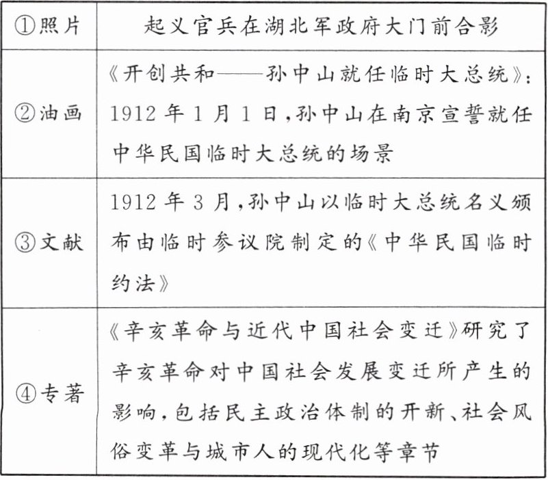(2)【示例一】主题1:辛亥革命的真实场景。选择材料:①。理由:①照片是了解辛亥革命中武昌起义这一真实场景的重要史料。【示例二】主题2:辛亥革命的重大成果。选择材料:②③。理由:②油画和③文献反映了辛亥革命的重大成果,即成立中华民国,推翻清王朝的统治,结束君主专制制度,制定中国历史上第一部具有资产阶级共和国宪法性质的重要文件——《中华民国临时约法》。【示例三】主题3:辛亥革命的影响。选择材料:④。理由:④专著从政治体制变革、社会思潮演变、社会风俗变革等角度说明了辛亥革命的影响。