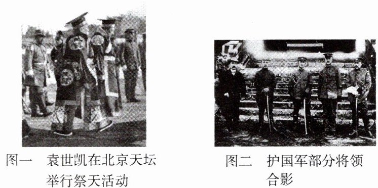 (3)图一:袁世凯复辟帝制。图二:护国战争。联系:在袁世凯复辟活动的背景下,蔡锷等人在云南宣告独立,组织护国军北上讨袁,护国战争爆发。