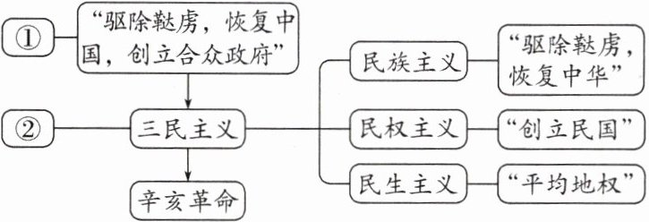 ①兴中会;②中国同盟会。联系:三民主义在辛亥革命中起到了指导思想的作用,它指明了革命的方向,成为革命党人奋斗的目标;辛亥革命进一步宣传了三民主义思想。