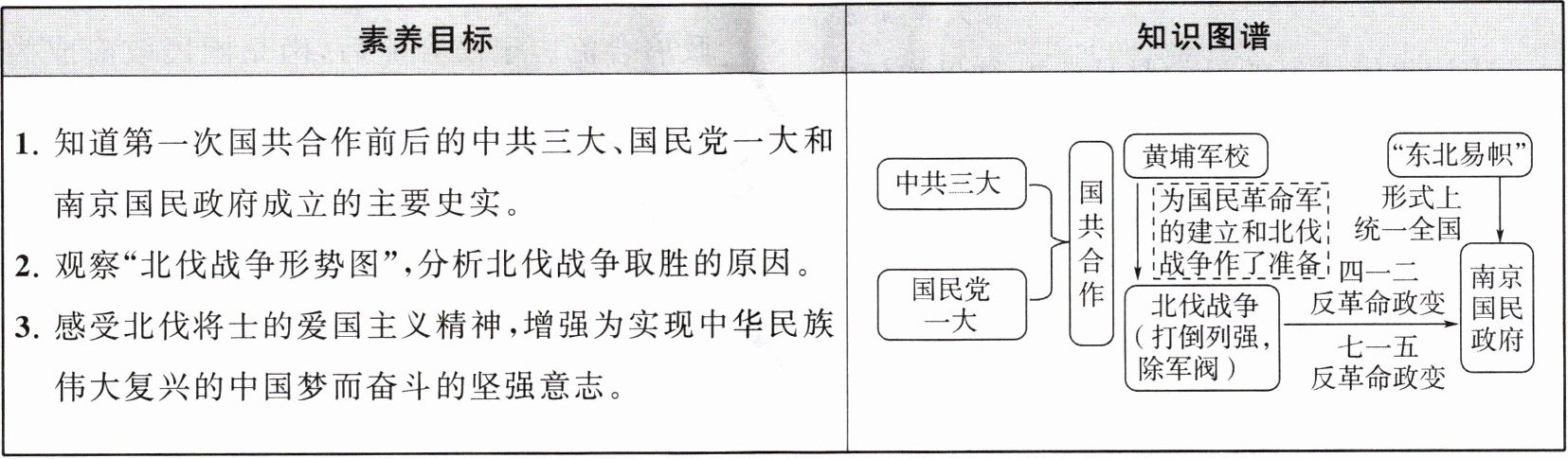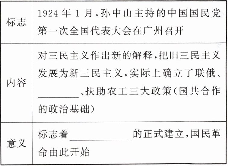 1.(1)革命统一战线 (2)国民党 2. 联共 国共两党合作 3.(1)1924 黄埔 (2)孙中山 蒋介石 (3)北伐