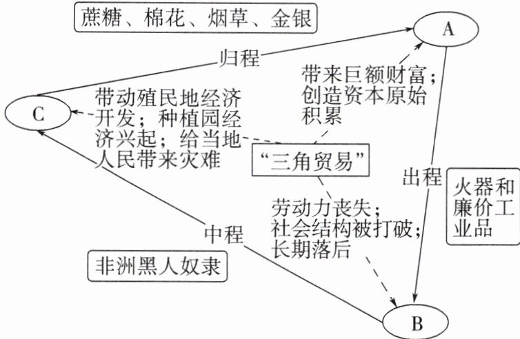 (3)A:欧洲。B:非洲。C:美洲。对欧洲:促进了资本原始积累和欧洲资本主义的发展;等等。对非洲:使非洲丧失大量劳动力,人口锐减,造成了贫穷与落后;等等。对美洲:增添了很多劳动力,加速美洲的开发和发展;给当地人民带来灾难;等等。