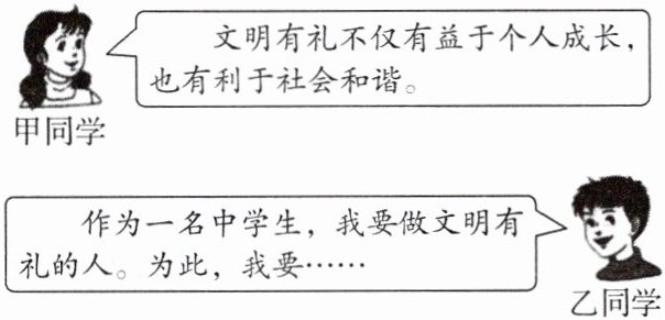中华民族是礼仪之邦。“不学礼,无以立”“人而无礼,焉以为德”。《道德与法治》课堂上,同学们围绕“文明有礼”这一话题展开讨论。下面是甲乙两位同学的发言: