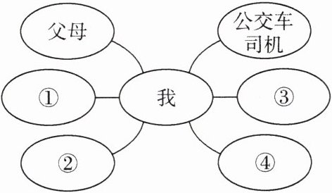 探究任务 1. ①人是社会的人。我们都是社会的一员,每个人在社会中都有其相应的位置。②人的身份是在社会关系中确定的。在不同的社会关系中,我们具有不同的身份。③社会为人的生存和发展提供必要条件。每个人都从社会中获得物质支持和精神滋养。④社会的发展离不开每个人的努力。任何一个社会的存在和发展,都是人们共同努力的结果。 2. 血缘关系、业缘关系、地缘关系。 拓展任务 同学、老师、邻居、服务员。(言之有理即可)