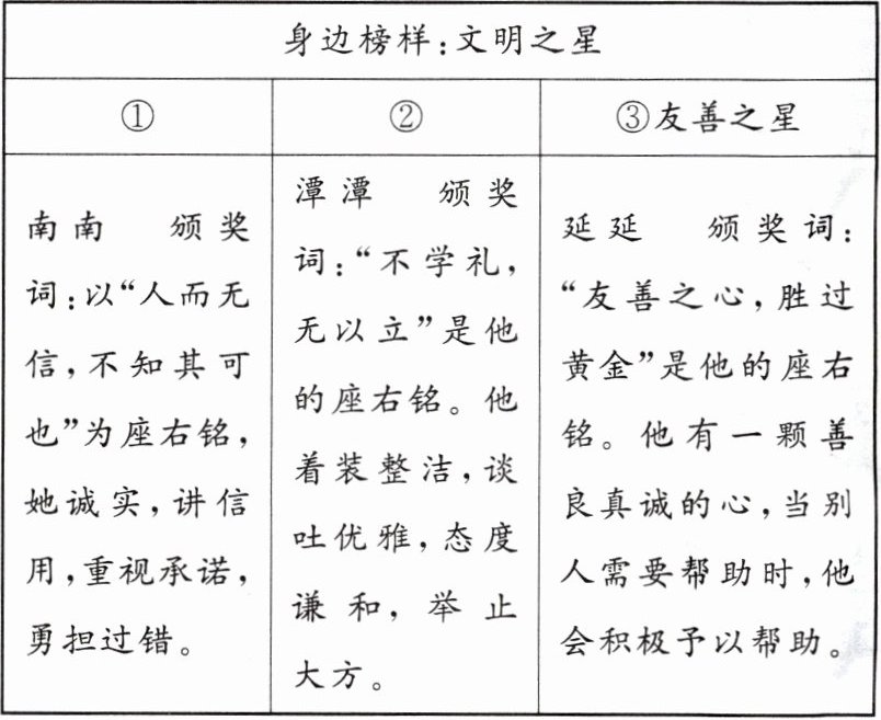 5. ①诚信之星。②礼貌之星。6. ①选择南南的座右铭"人而无信,不知其可也":诚信是中华民族的传统美德,是社会各行各业的共同道德要求,也是社会主义核心价值观和公民基本道德规范的重要内容。人以诚信立身。诚信促进社会文明。②选择潭潭的座右铭"不学礼,无以立":文明有礼是调整和规范人际关系的行为准则,直接体现一个人的基本素质,也事关社会风尚、国家形象。文明有礼是一个人立身处世的前提。文明有礼促进社会和谐发展。文明有礼塑造良好国家形象。③选择延延的座右铭"友善之心,胜过黄金":友善是社会主义核心价值观的要求,是中华民族的传统美德。在社会生活中,以友善的态度对待他人,彼此尊重、包容多样,能够传递温情与爱心,加深社会成员之间的信任,营造互信互助的社会风气,促进社会和谐。自己的座右铭:君子养心,莫善于诚。