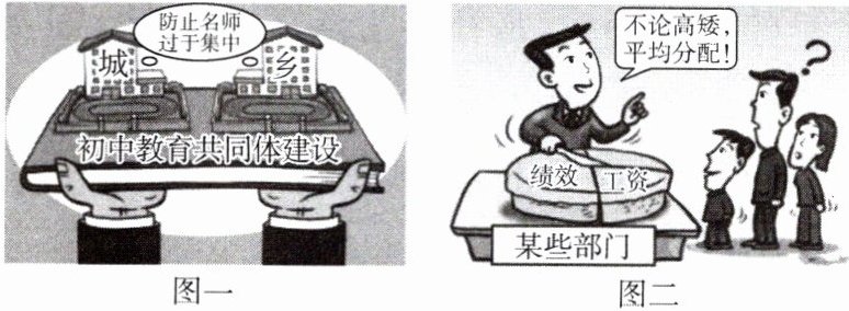 (1)①图一:促进教育均衡发展。②图二:劳动成果分配不公。(2)①面对利益冲突,我们要站在公平的立场,学会担当,以公平之心为人处世。②遇到不公平的现象时,我们要坚守原则立场,敢于对不公平说“不”,采用合理合法的方式,谋求最大限度的公平,努力营造公平的环境。