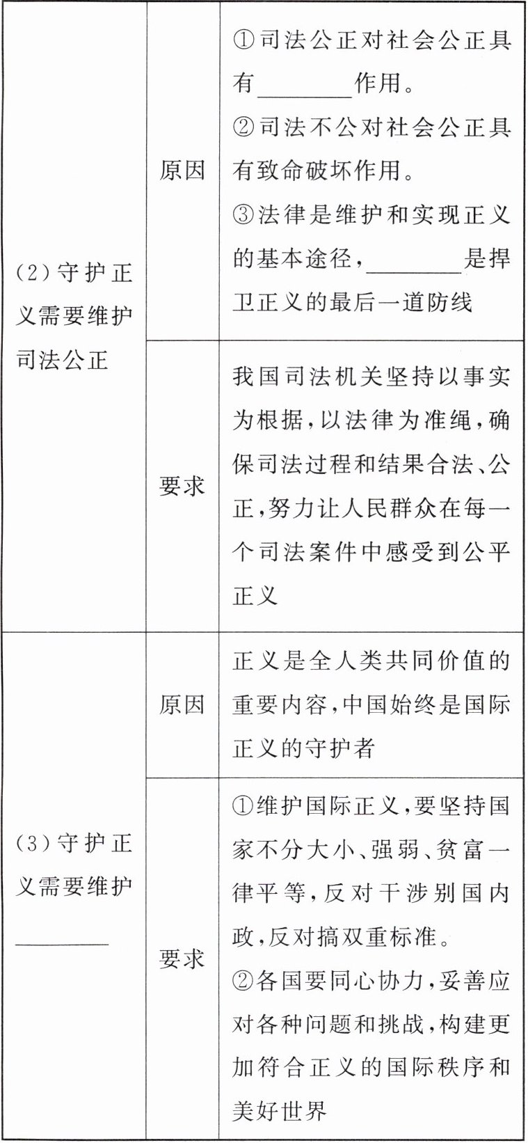 | (3)守护正义需要维护____ | 原因正义是全人类共同价值的重要内容,中国始终是国际正义的守护者要求①维护国际正义,要坚持国家不分大小、强弱、贫富一律平等,反对干涉别国内政,反对搞双重标准。②各国要同心协力,妥善应对各种问题和挑战,构建更加符合正义的国际秩序和美好世界 |