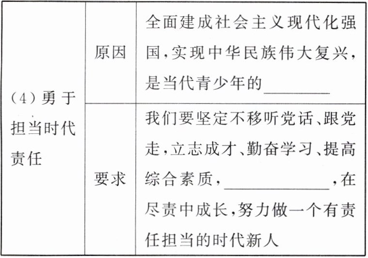|(4)勇于担当时代责任|原因|全面建成社会主义现代化强国,实现中华民族伟大复兴,是当代青少年的______|